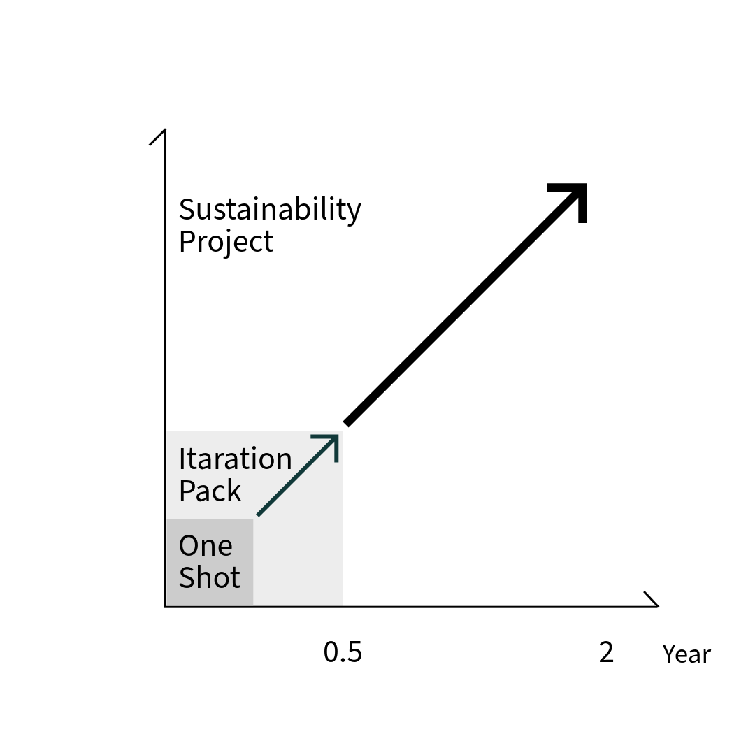 プロジェクトの終わりが見えない不安を解放します。例えば、OneShotで問題が解決しなかった場合、原因調査と対応を行うItaration-Packへ移行します。その後、さらなる調査や試行錯誤が必要になった場合、Sustainability Projectへ移行します。